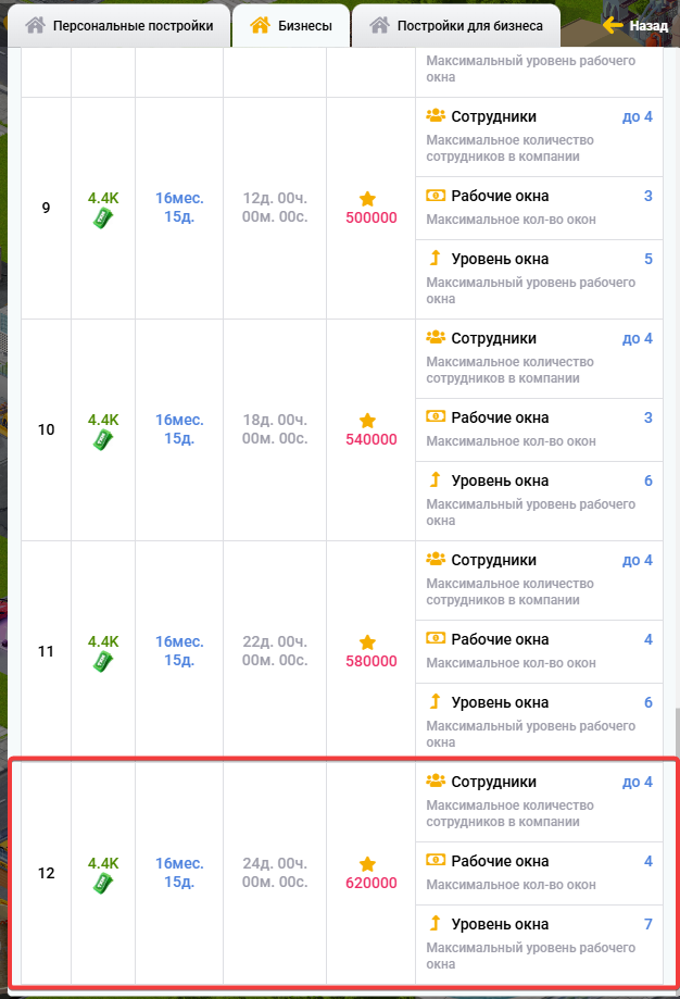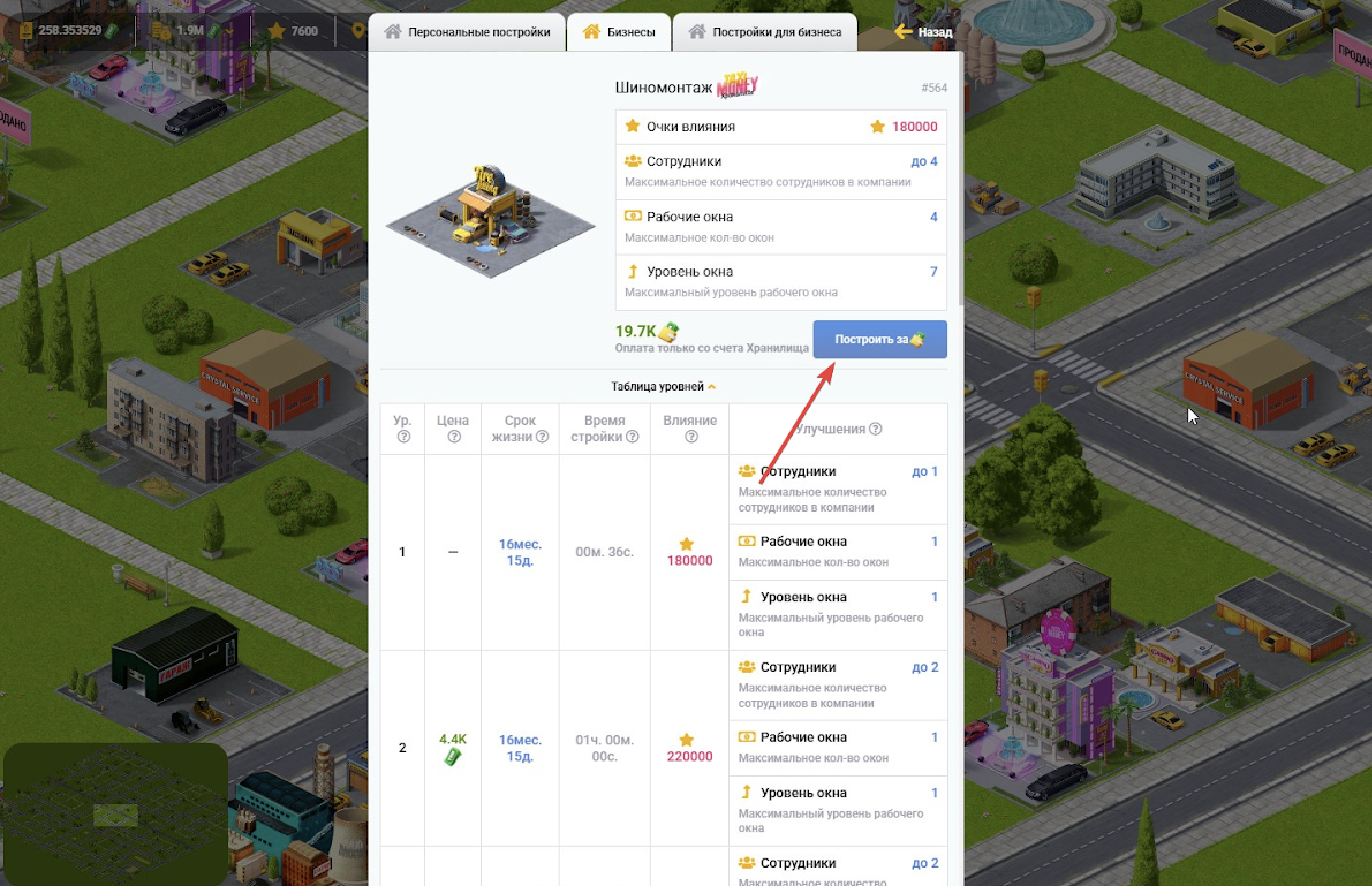 Прокачивайте уровень здания и увеличивайте количество доступных рабочих мест, усиливайте влияние и зарабатывайте больше!